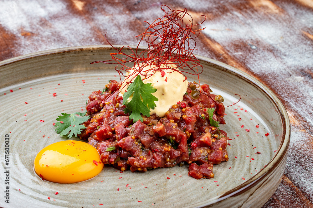 Veal tartare with jelly and mustard. Haute cuisine. On a wooden background.