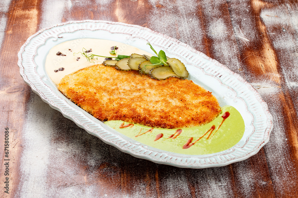 Viennese chicken schnitzel with sauces and pickles. Haute cuisine. On a wooden background.