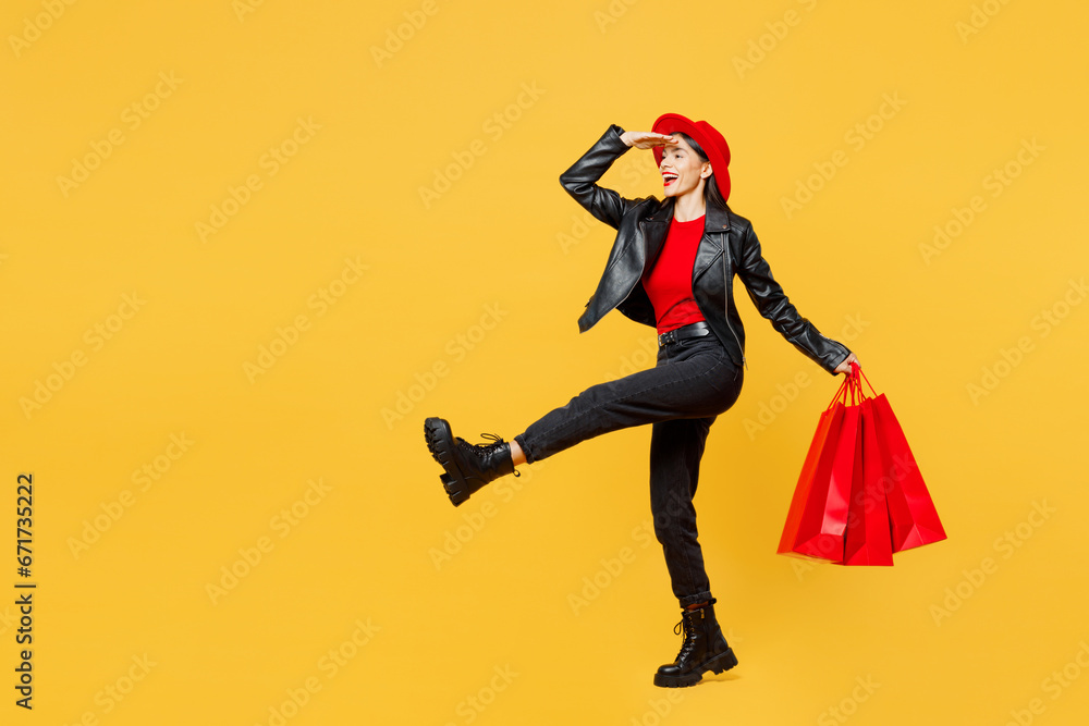 Full body young woman wear casual clothes red hat hold shopping paper package bag keep hand at forehead look far away distance go isolated on plain yellow background Black Friday sale buy day concept