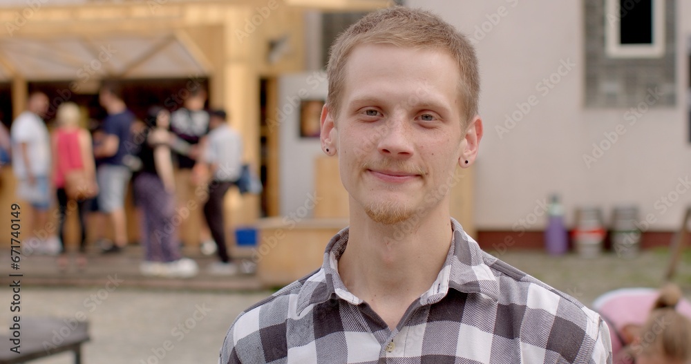 Portrait of smiling young man in urban life captures the essence of vibrant and dynamic city scene. Happy Teenager exuding positivity and enthusiasm Positive emotions radiating teenager face outdoor.