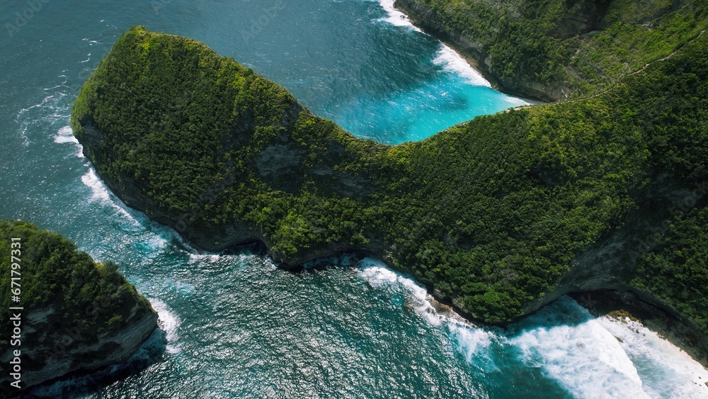 Mountain rainforest on rocky ocean coastline. Clear sea waves wash Nusa Penida exotic island, Bali Indonesia. Kelingking beach.