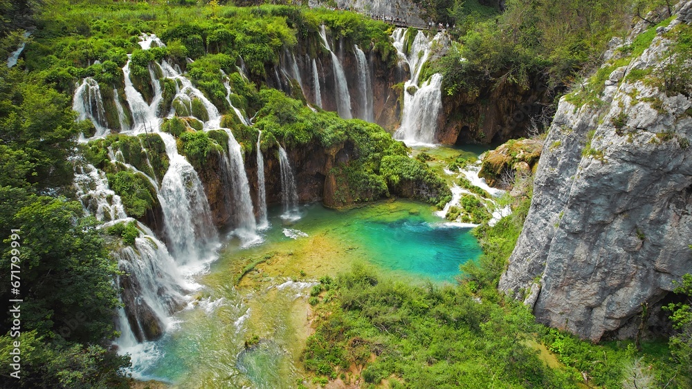Summer forest and mountain landscape with streams of water and waterfalls. Cascades flow among lush greenery.