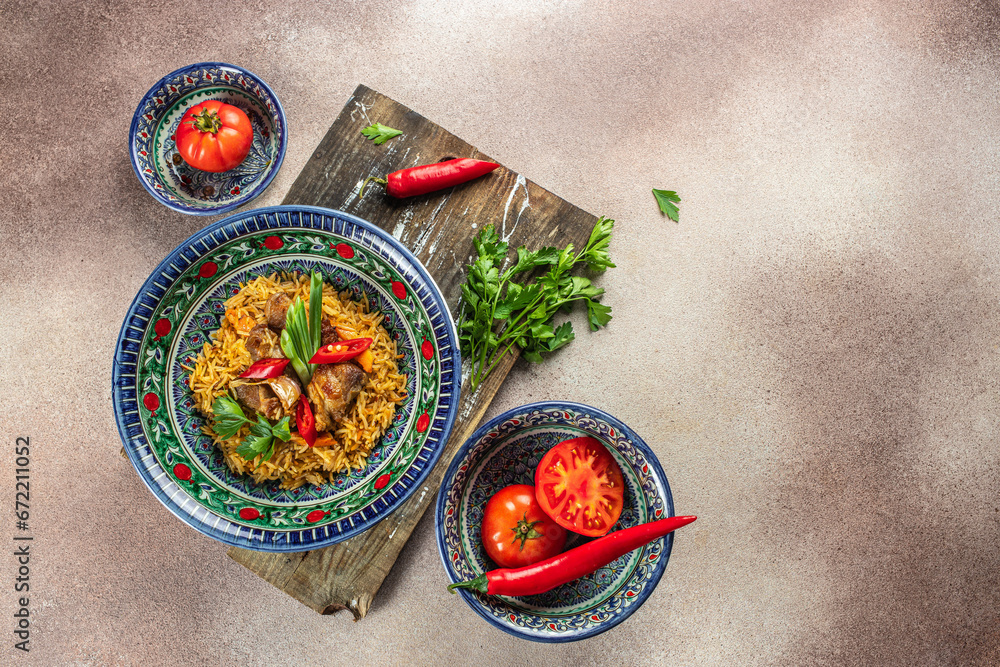 tasty Asian pilaf in plate with oriental ornament, Uzbek oriental cuisine on a light background top view. place for text