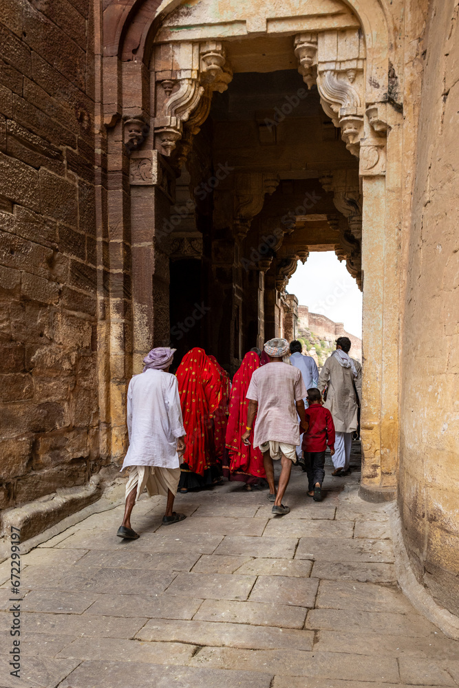 People walking inside Mehrangarh Fort in Jodhpur in Rajasthan, India. The blue city