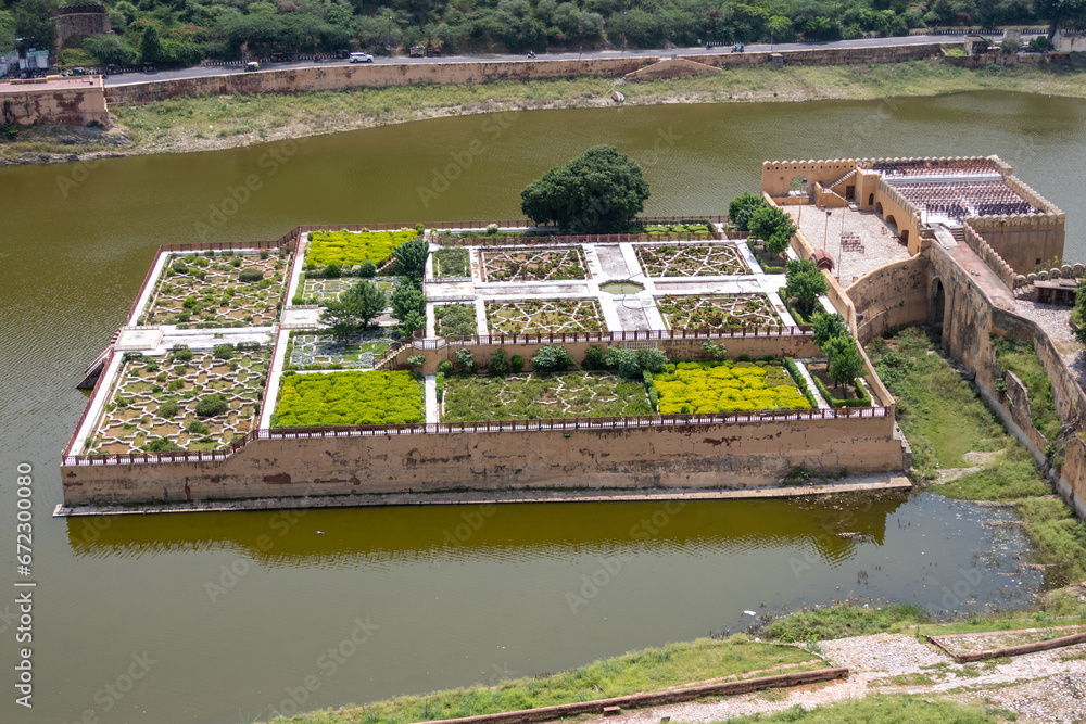 View of the lagoon gardens of Amber Fort in daytime, near Jaipur, The Pink City, Rajasthan, India