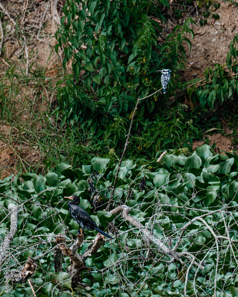 Pied Kingfisher perched on a cactus in the Ugandan wilderness