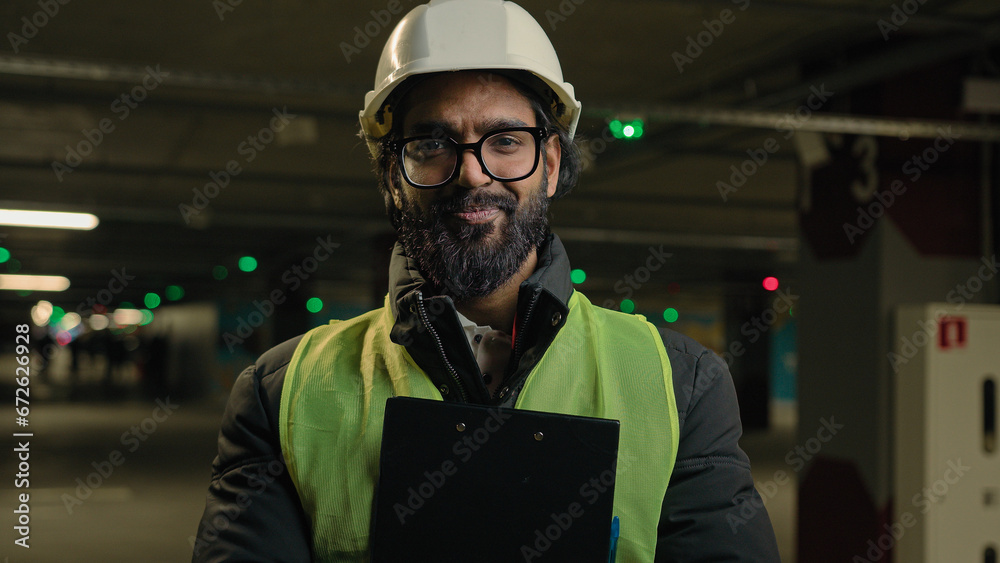 Indian contractor mechanic guy in helmet and glasses smile posing with clipboard folder. Arabian bearded man in eyeglasses worker male specialist manufacture work. Engineer in hard hat safety uniform