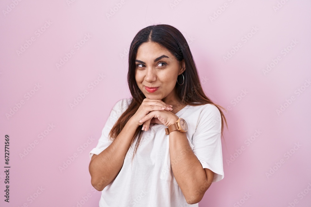 Young arab woman standing over pink background laughing nervous and excited with hands on chin looking to the side