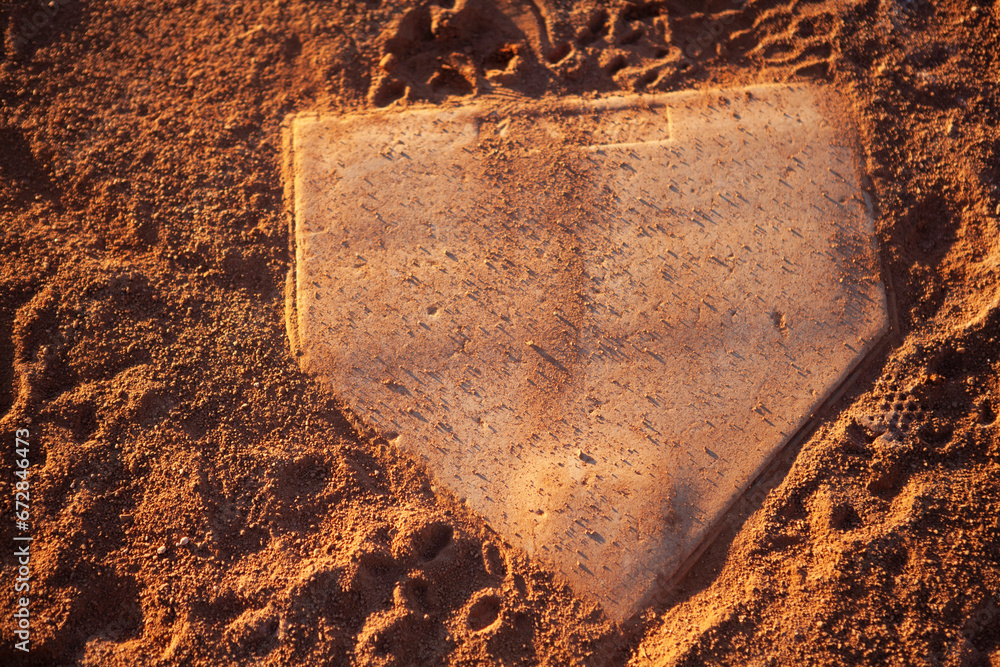 Baseball home base on infield dirt, detail