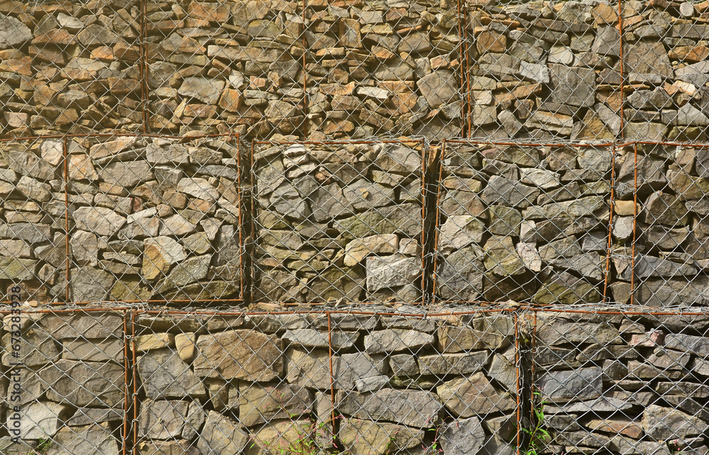 Photo of several gabions. The mesh cells of the cubic form are filled with mountain stones of various shapes that let water through the rain, but protect the road from falling stones