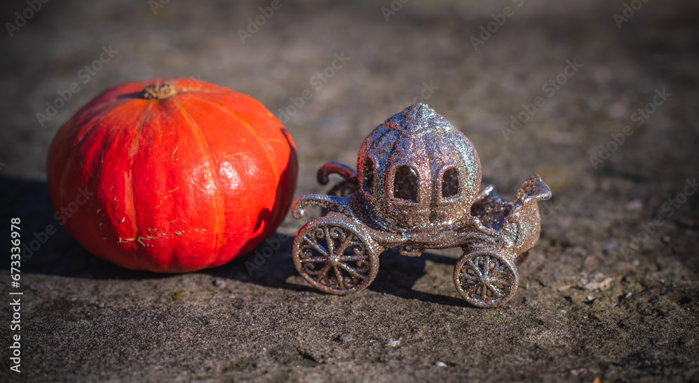 Fairy Tale concept. Carriage and pumpkin near. Magical Illustration