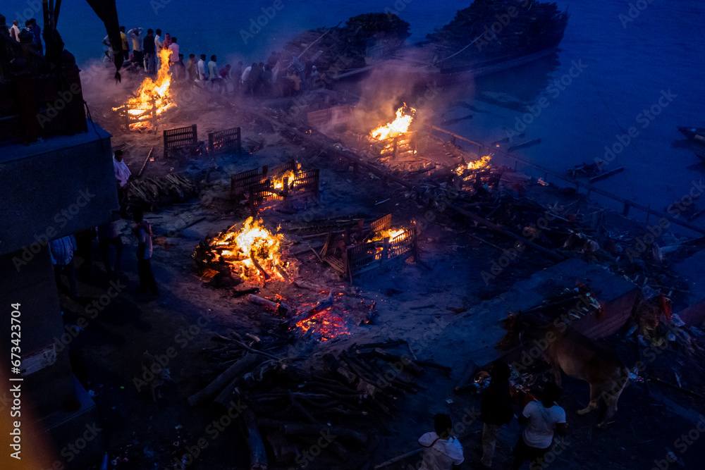 View of body cremation with firewood and fire on the banks of Ganges River at Manikarnika Ghat in Varanasi in India.