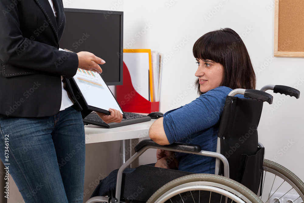 Woman on wheelchair analyzing charts with her boss