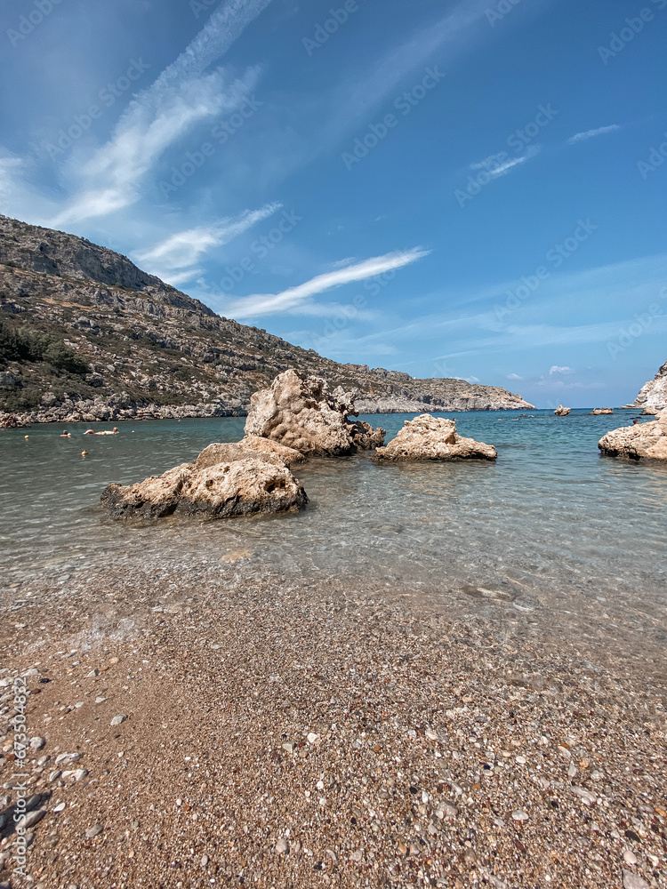 Baia di Antony Quinn isola di Rodi, Rhodos. Sole, mare e tramonto; montagne, colline città antica e acropoli.