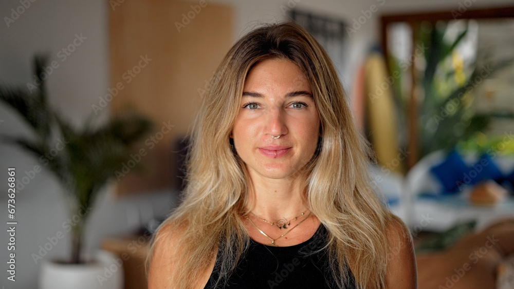 Female face portrait close up. Happy hippie gen z woman looking at camera. Joyful piercing girl smiling. Young adult australian person inside house. Pretty american people wear ring. Cute hipster lady