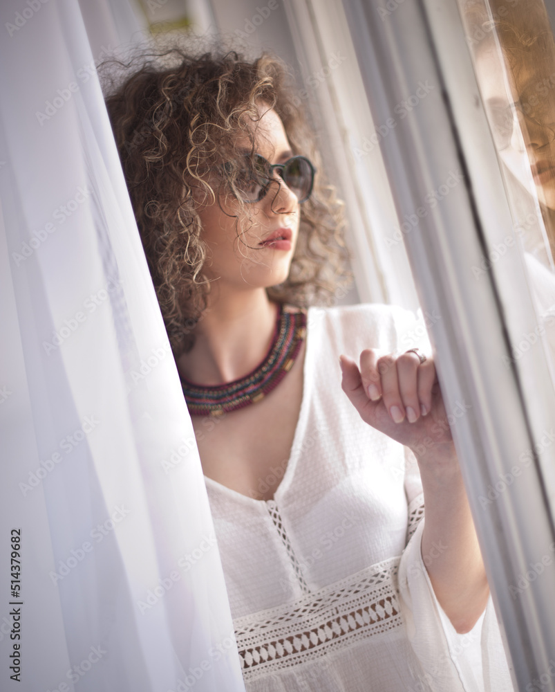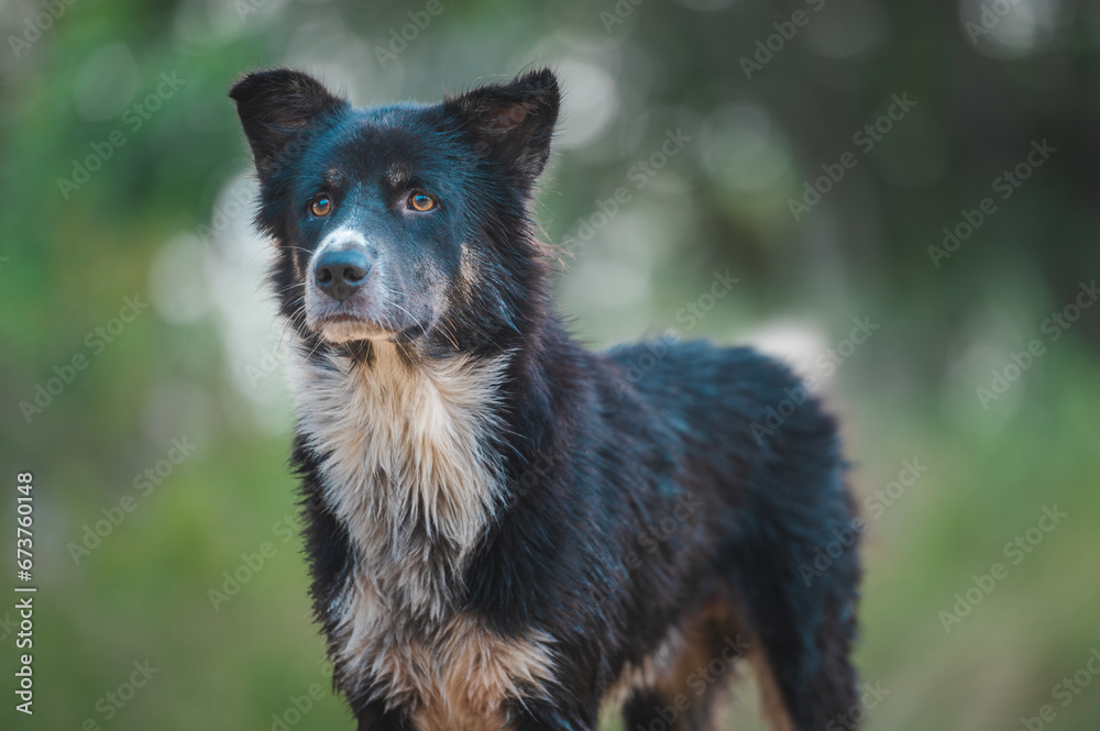 Noble black dog with white markings gazes away, its wet fur glistening, against a blurred green forest backdrop.