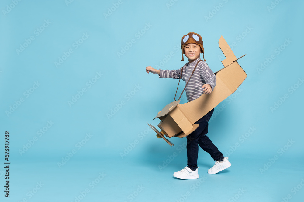 Asian little boy aviator playing with cardboard airplane isolated on blue sky background, Kid toy diy concept