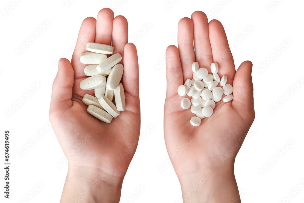 Pills in Hands Isolated on White Background. Pile of Different Tablets in Children Hands. Healthcare Medical Medicine Prevention for Children on Flu Season.