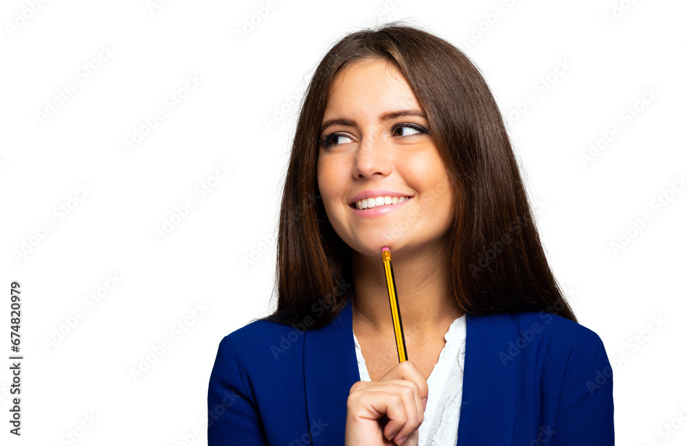 Woman having an idea holding a pencil under her chin isolated on white