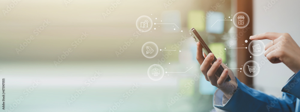 Use your smartphone to shop online, Open bank application to pay for the product, Online stores are searched by customers using smartphones, Use your smartphone to do online activities.