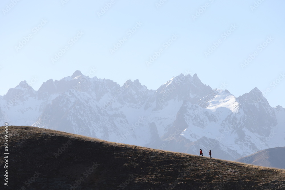 Group of mountaineers climbing a snowy mountain. Beautiful landscape background with silhouettes of climbers hiking on a peak.turkey