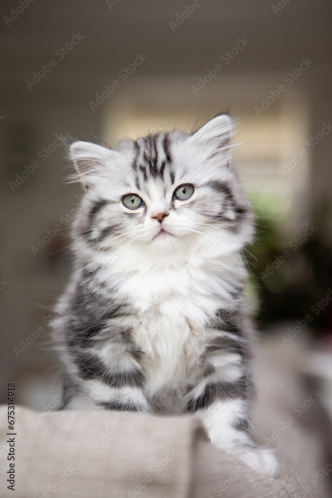 langhaarige kleine Katze auf dem Sofa im Wohnzimmer in natürlich wohnlicher Umgebung