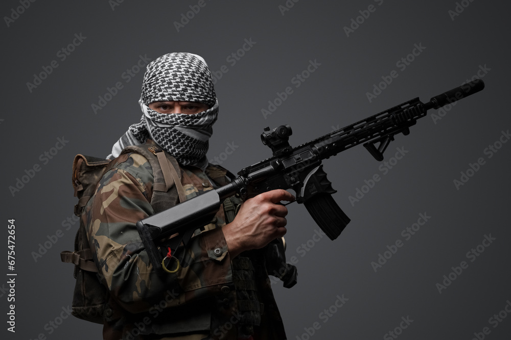 Militant from the Middle East, dressed in a white keffiyeh and camouflaged field attire, wielding an automatic rifle, set against a neutral gray backdrop