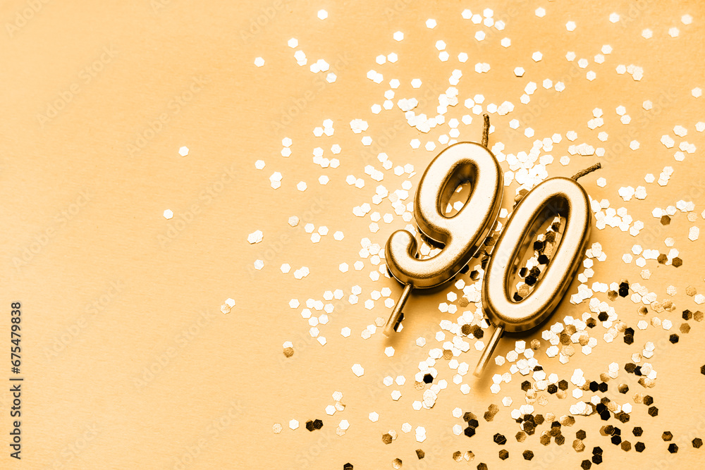 90 years celebration festive background made with golden candles in the form of number Ninety lying on sparkles. Universal holiday banner with copy space.
