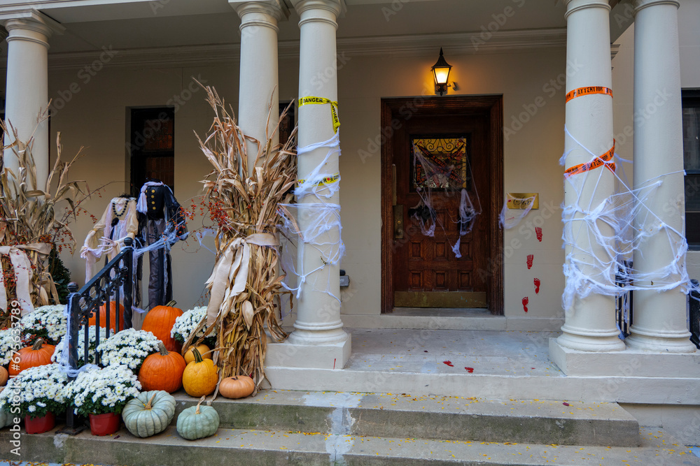 Colorful Pumpkins and Flowers on the Stairs of an Old Brownstone Home in New York City during Autumn. High quality photo