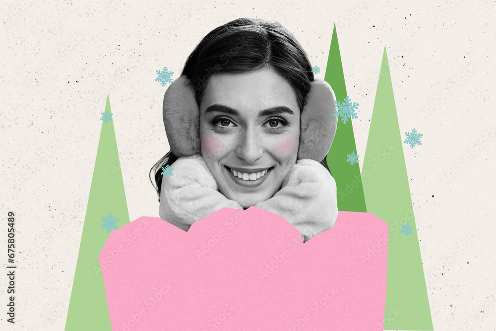 Photo collage artwork minimal picture of dreamy cute smiling lady celebrating x-mas isolated creative background