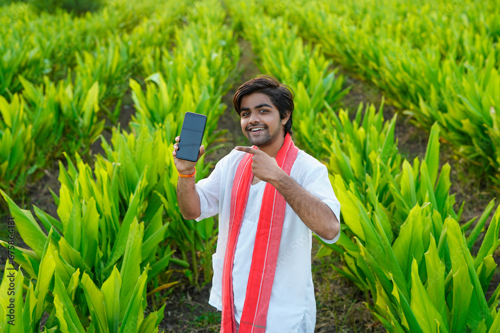 Indian farmer showing smart phone screen at green turmeric agriculture field.