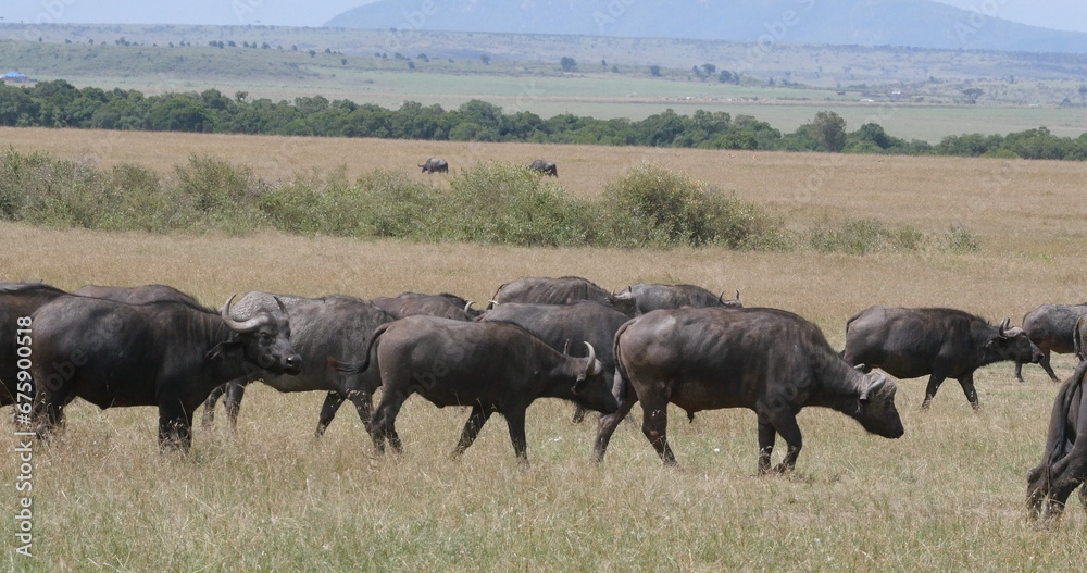 African Buffalo, syncerus caffer, Herd standing in Savannah, Masai Mara Park in Kenya