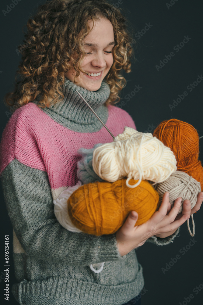 Woman holding in her hands plush knitting yarn on black background. Yarn for knitting toys, children's and adult clothes, interior items. Handmade hobby.