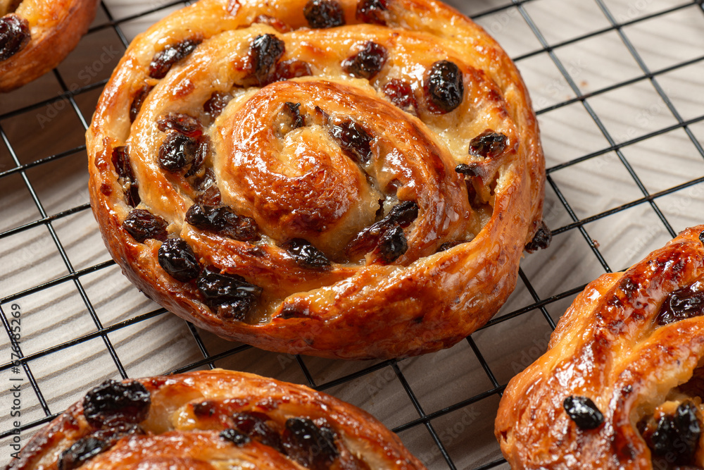Pain aux raisins, also called escargot or pain russe, is a spiral pastry often eaten for breakfast in France. Its names translate as raisin bread, snail, and Russian bread respectively.