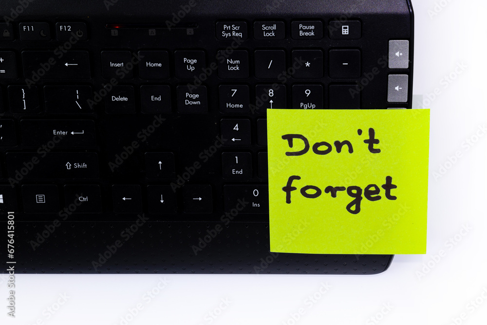 Yellow memo-stick sticker on computer laptop keyboard reminder