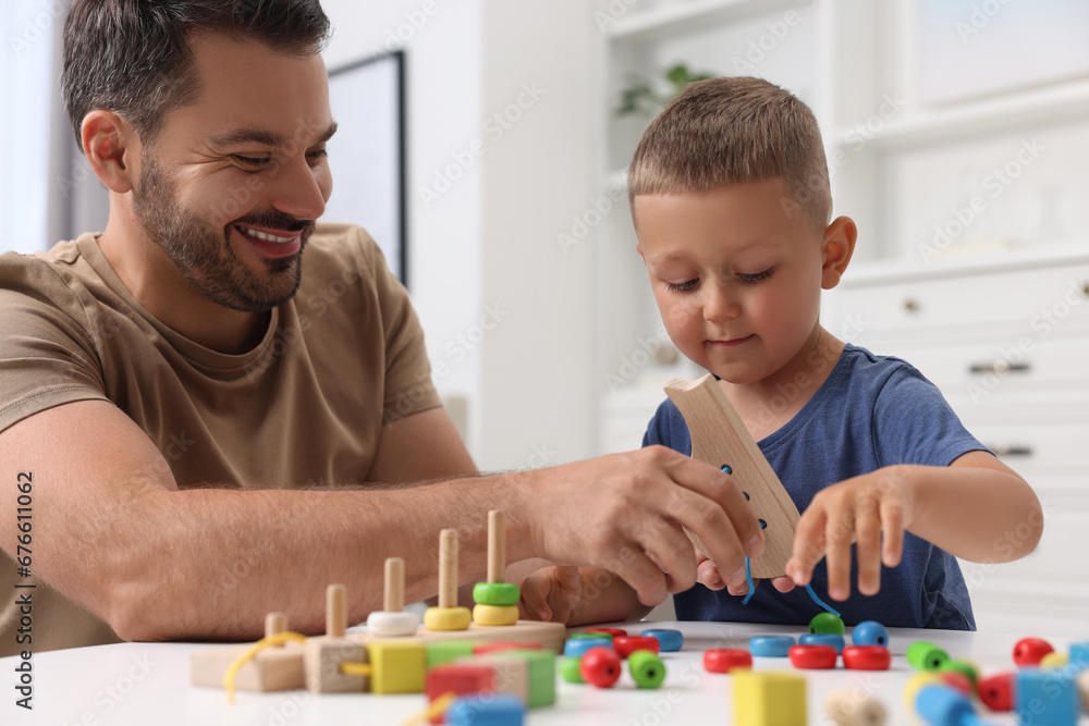 Motor skills development. Father and his little son playing with wooden lacing toy at white table indoors