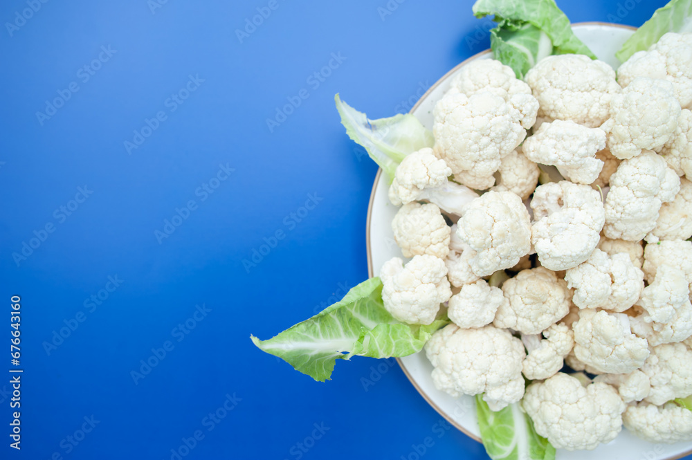Cauliflower inflorescences close-up on a plate, top view, blue background, space for text