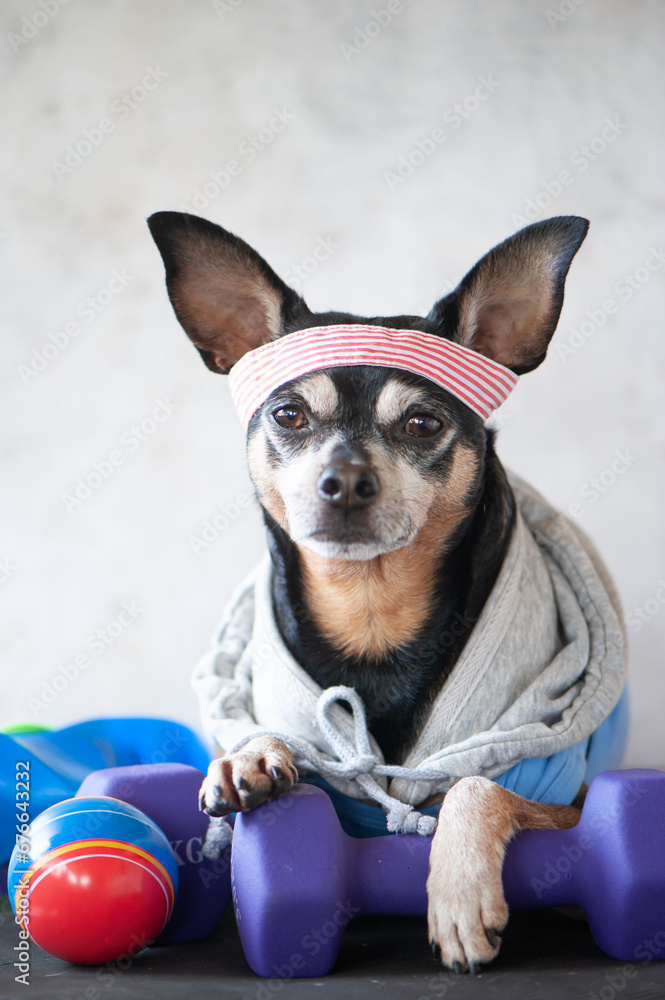 Dog fitness. Fitness and healthy lifestyle for pet. Dog trainer portrait in studio surrounded by sports equipment
