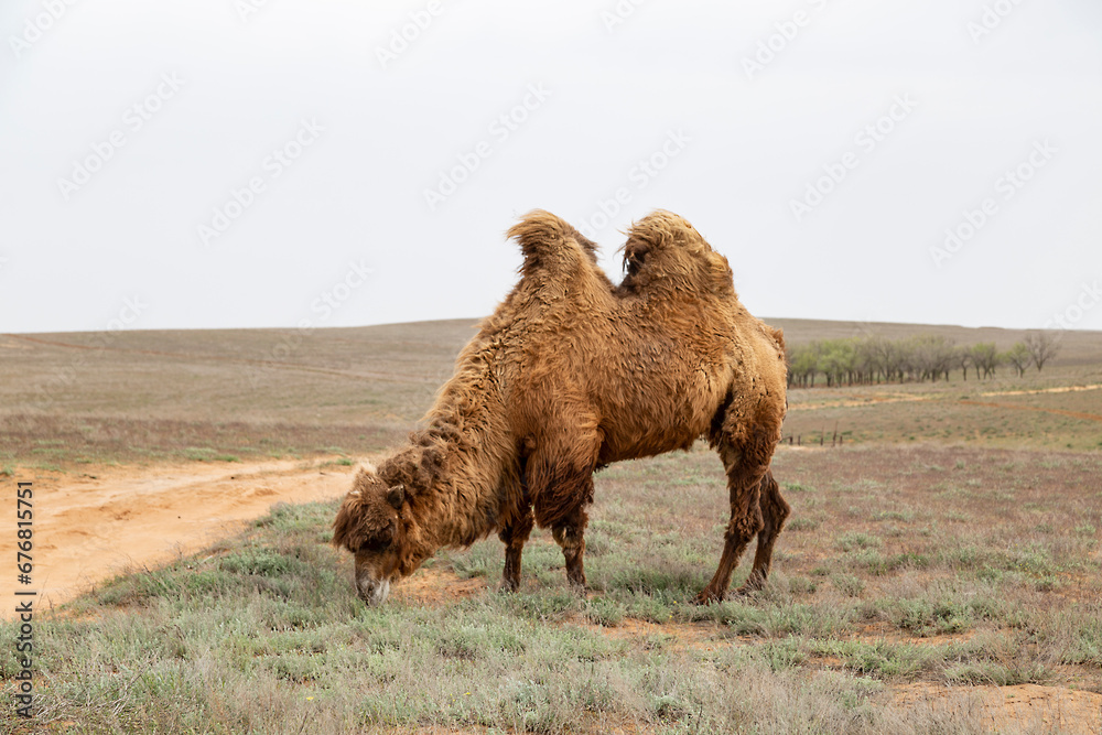 A double-humped camel, or bactrian, grazes in the Astrakhan steppe
