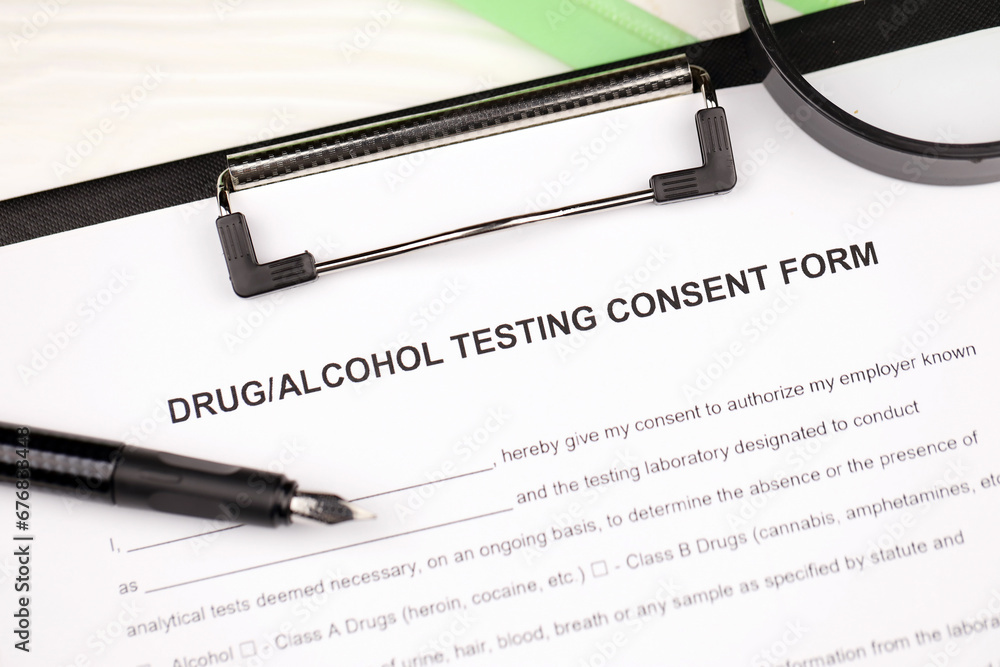 Drug and alcohol testing consent form on A4 tablet lies on office table with pen and magnifying glass close up