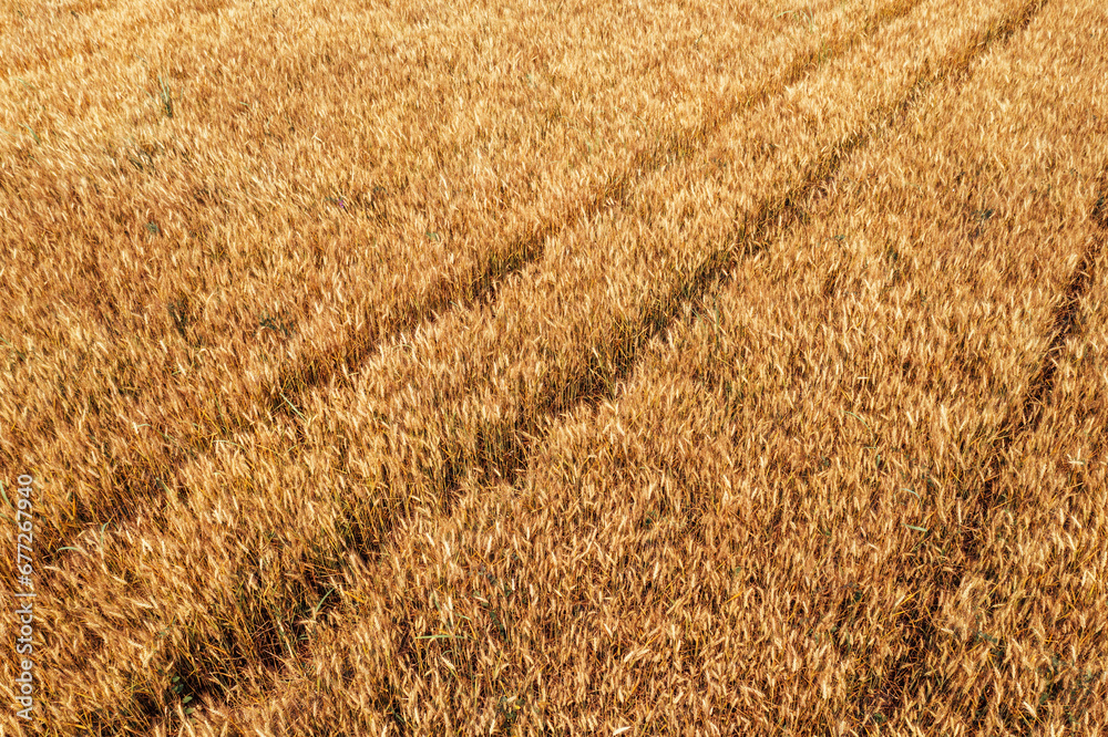 Aerial shot of ripe wheat plantation field in summer, harvest ready cereal crops from drone pov