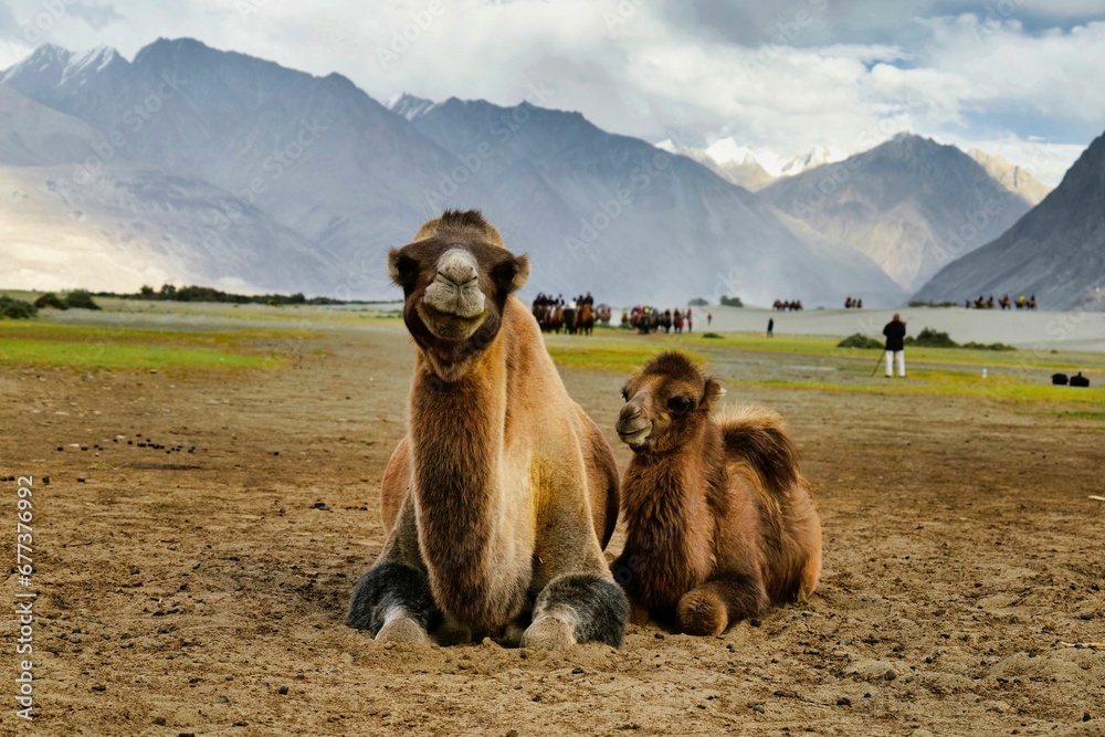 Closeup of Bactrian camels (Camelus bactrianus) sitting in the Nubra valley in Ladakh, India