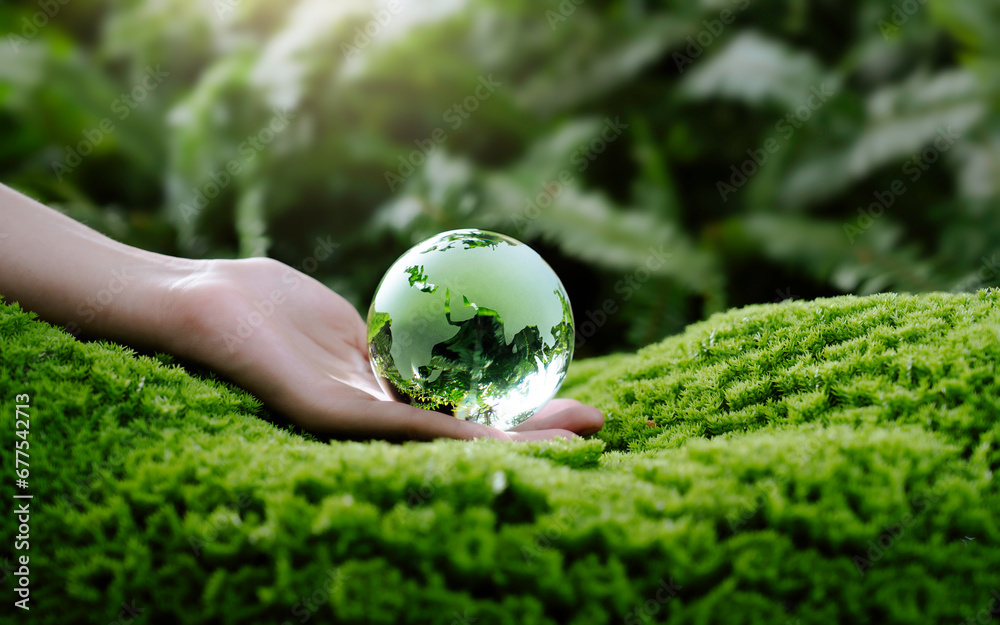 Save Earth. Concept of Environment World Earth Day. Reduce Emission or Carbon Neutral. Hands Holding Globe Glass On Green Forest With Moss For Saving The Environment, And Environmentally Sustainable.