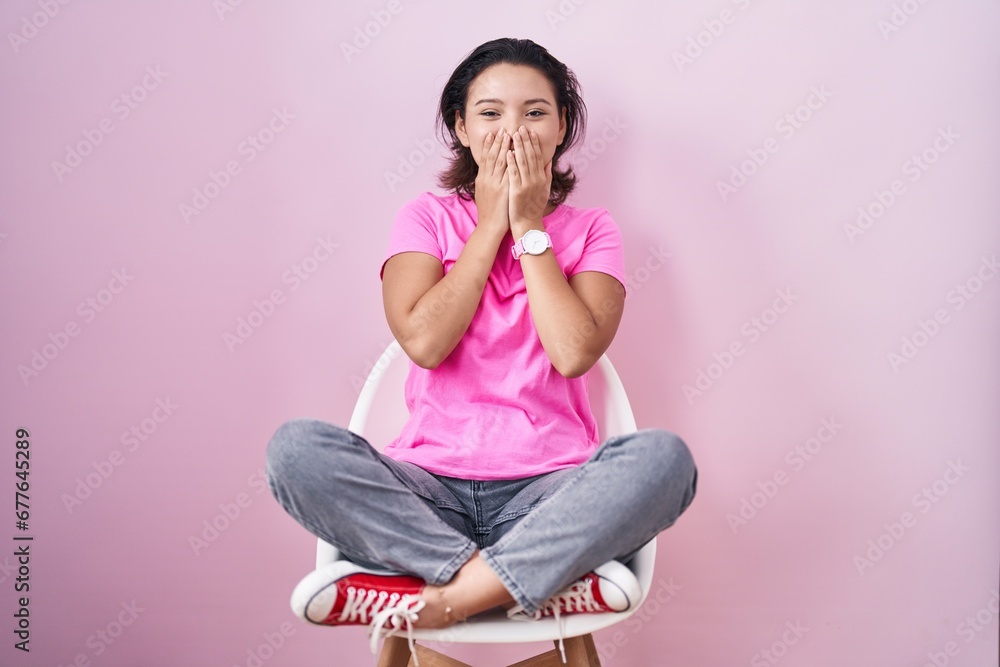 Hispanic young woman sitting on chair over pink background laughing and embarrassed giggle covering mouth with hands, gossip and scandal concept