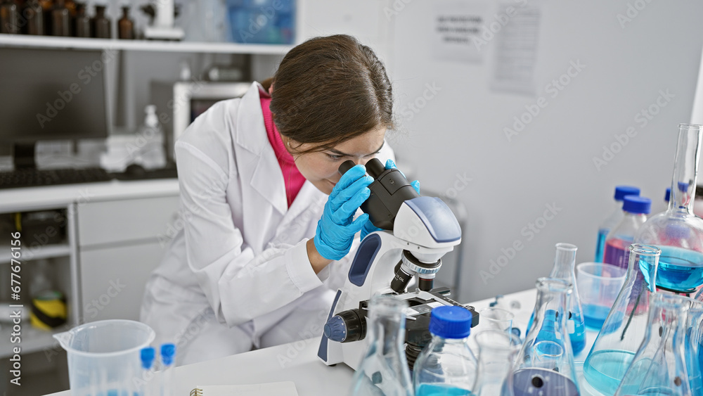 Determined young hispanic woman scientist, with beautiful hairstyle, engrossed in serious research using microscope technology in the lab.