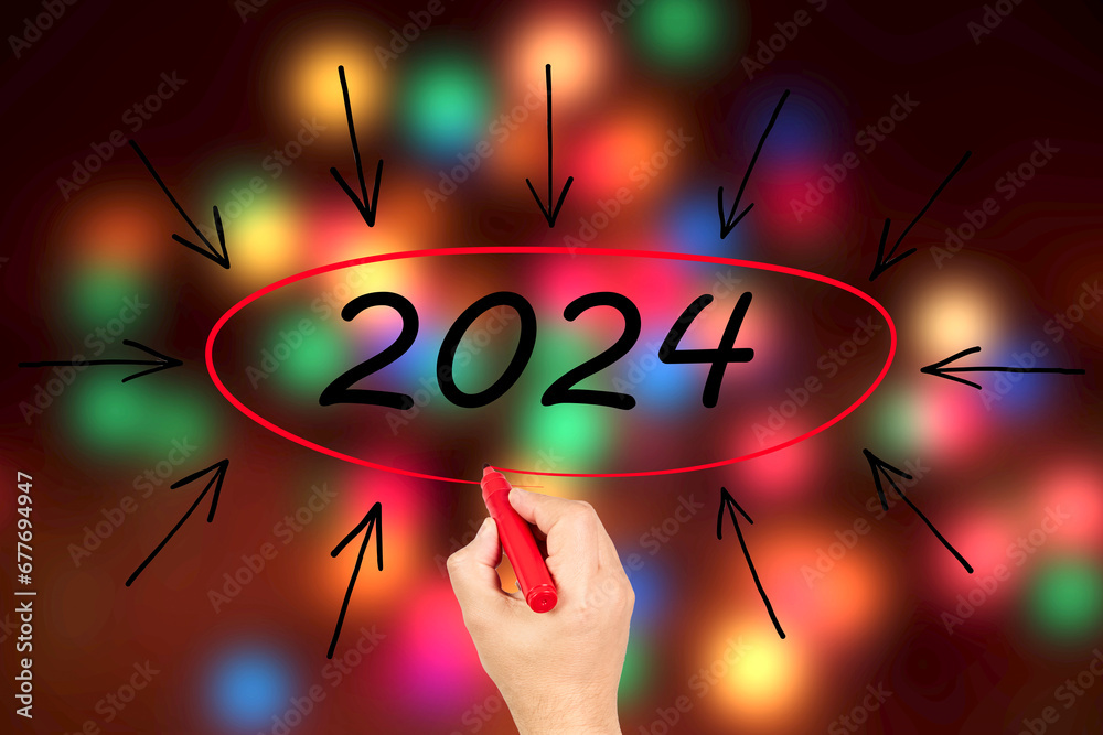 2024, Woman writing the number 2024 on background of faded lights. Happy New Year