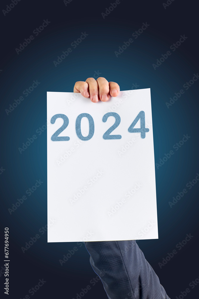 2024, Man holding cardboard with number 2024 on blue background. Happy New Year