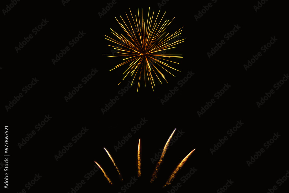 New Year's Night, Diwali, bonfire night Colourful Starbursts and Rocket Explosions on Black Background Sky with Red, Green, Blue, Purple, Gold Colour Fireworks Bursts with Space for Text-Smoke-free