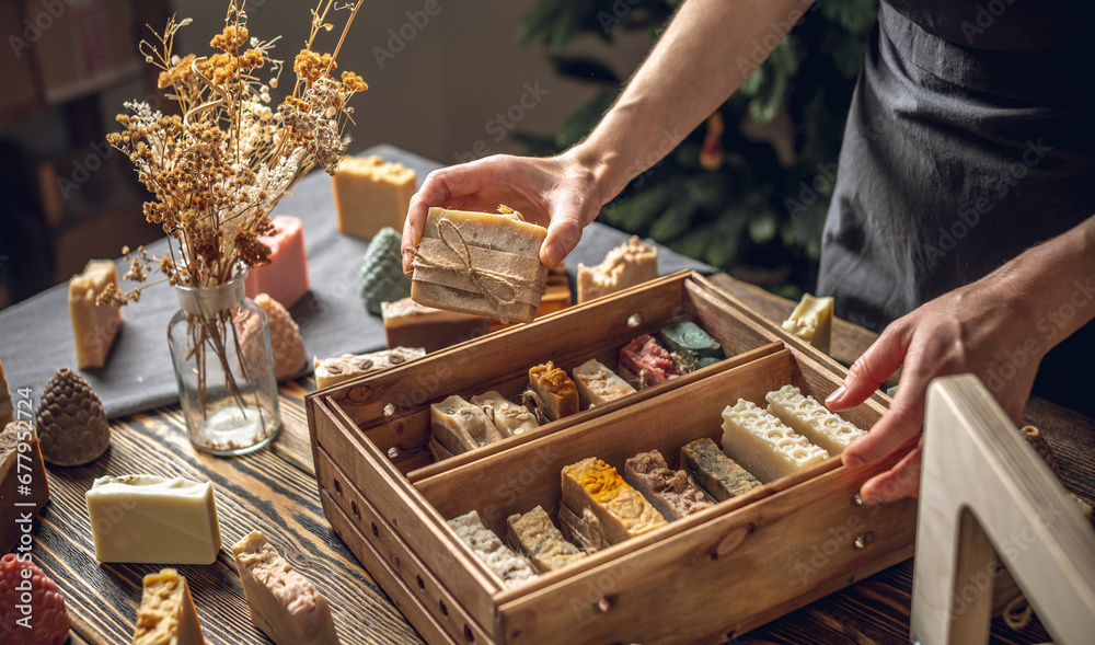 A woman soap maker holds handmade soap in her hands. A lot of different sliced pieces in a wooden box. Eco-friendly natural handmade cosmetics