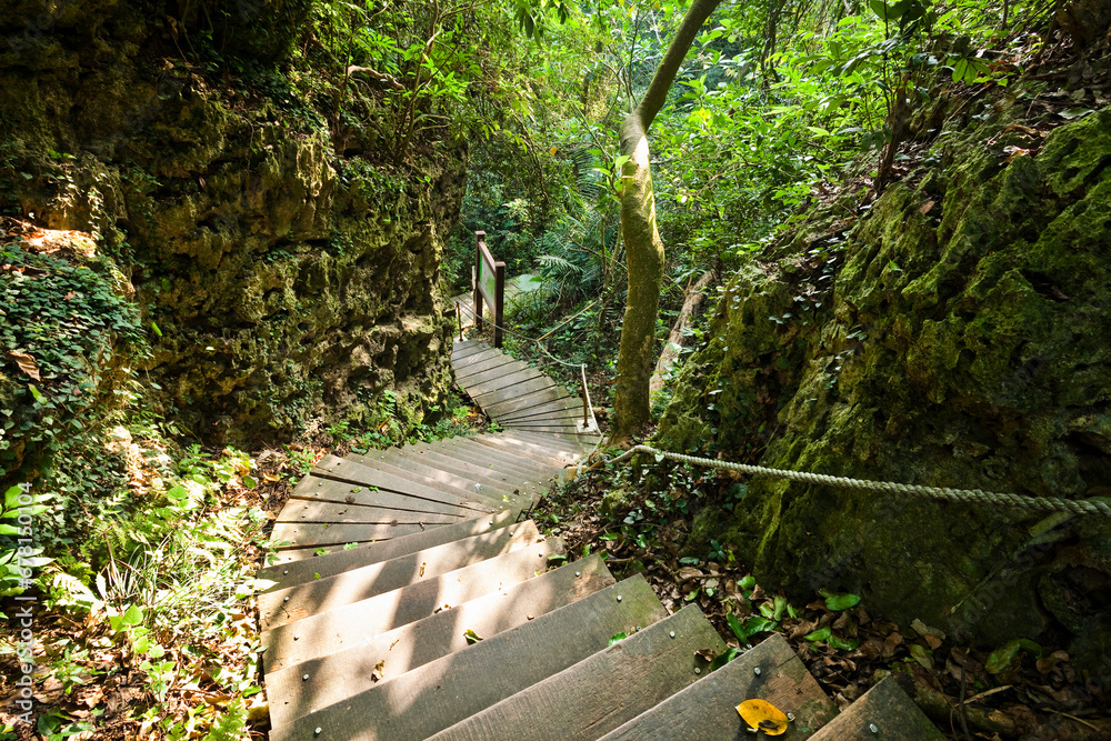 View of the boardwalk paths through the forest of mountains, This is Tzaishan(Shoushan) National Nature Park in Kaohsiung, Taiwan.